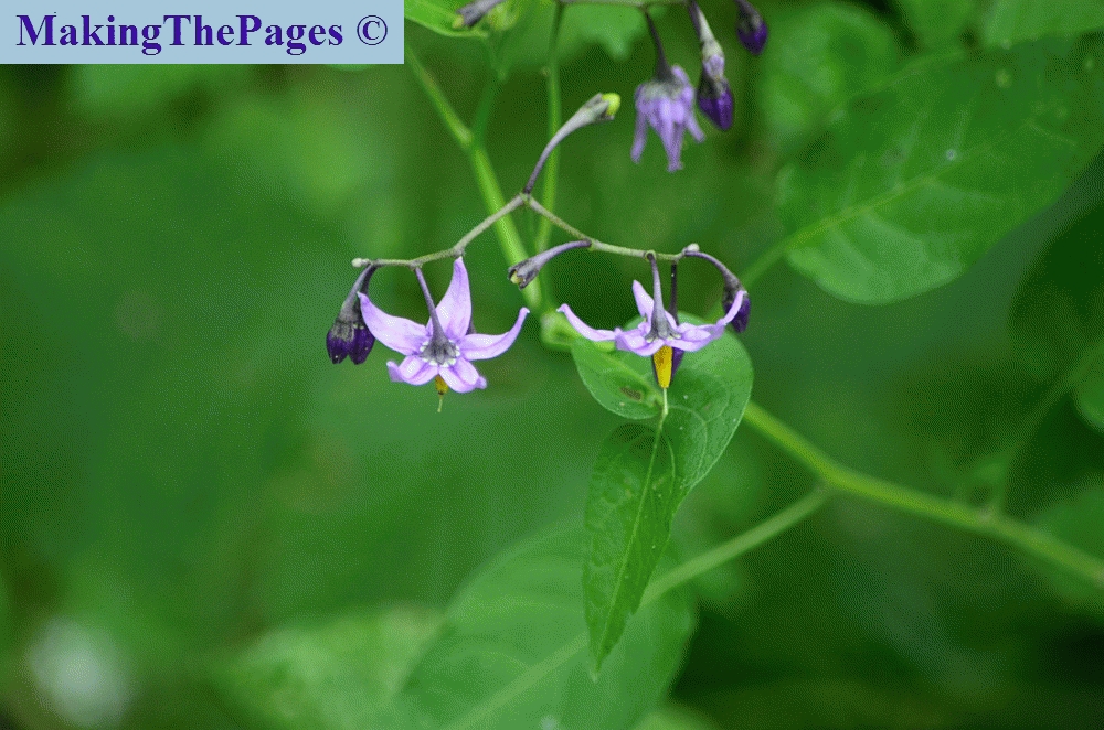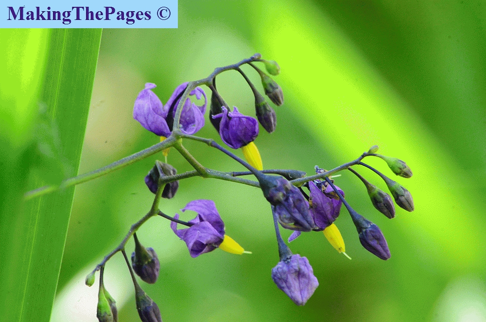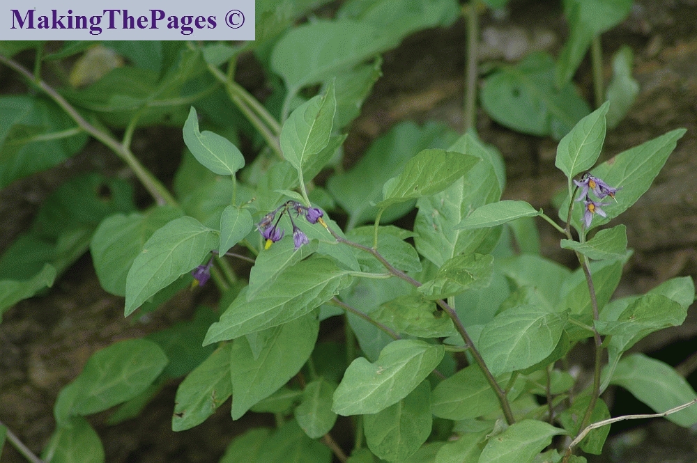 speciaal | Giftig: sterk giftig kan enstige ziekten of dood veroorzaken. Rode, giftige bessen. nachtschadefamilie, zeer herkenbare plant, typische nachtschade blad en bloem, maar dan paars, enige wilde nachtschade in Nederland met paarse bloemen en rode bessen. Andere wilde nachtschades hebben alle witte bloemen. Klimplant, woekert overal doorheen. U moet er dus op verdacht zijn dat u in een andere plant, boom, struik of in, langs een hek de specifieke blaadjes ziet. | ||